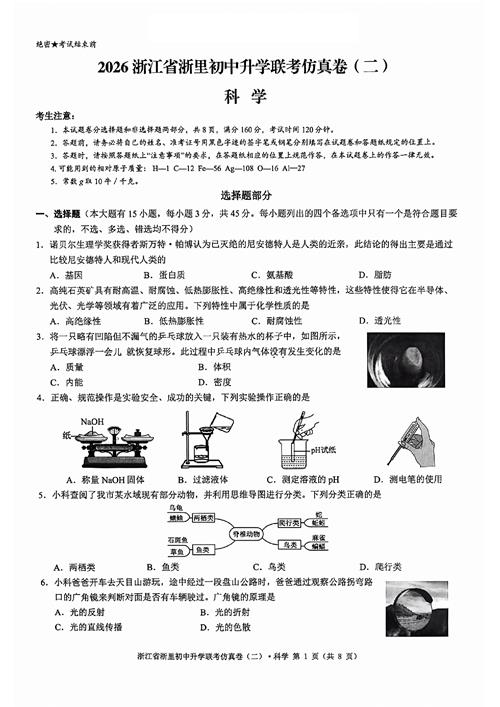 2603浙里初中升学联考仿真卷(二)(扫描附答案+答题卡)