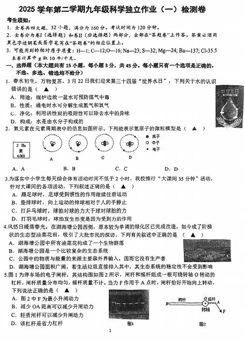 浙江省金华市南苑中学2025学年第二学期九年级科学独立作业(一)检测卷(扫描PDF版,无答案)