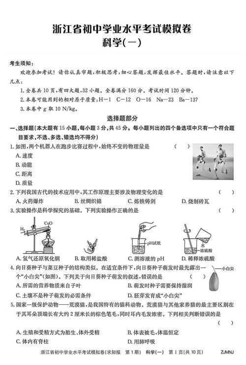 2026浙江省初中学业水平考试模拟科学(一)(扫描附答案)