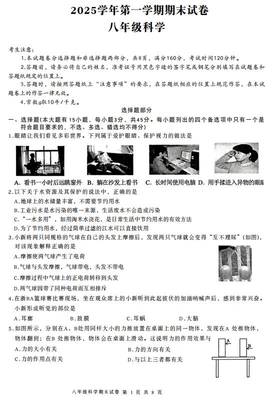 浙江省绍兴市新昌县2025学年第一学期期未试卷八年级科学(扫描PDF版,含答案)