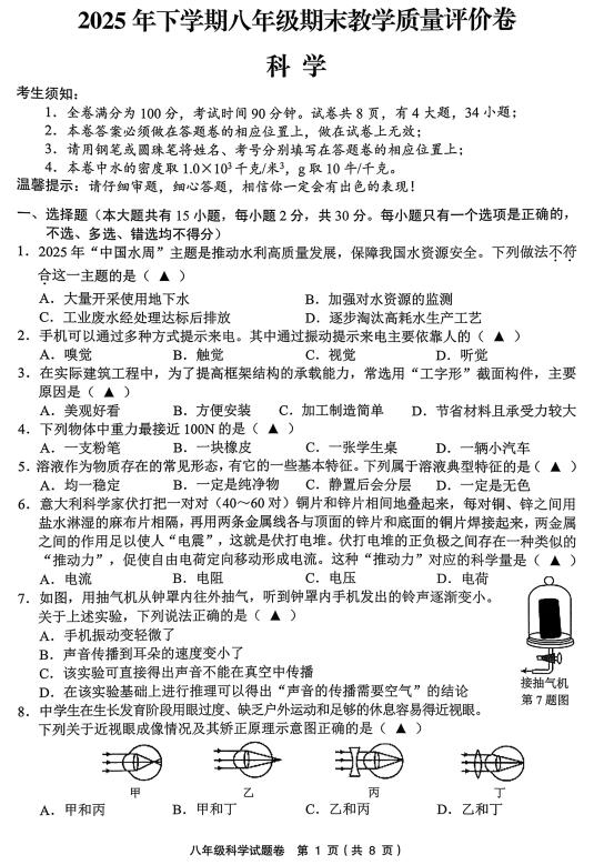浙江省金华市义乌市2025年下学期八年级期末教学质量评价卷 科学(扫描PDF版,含答案+答题卷)