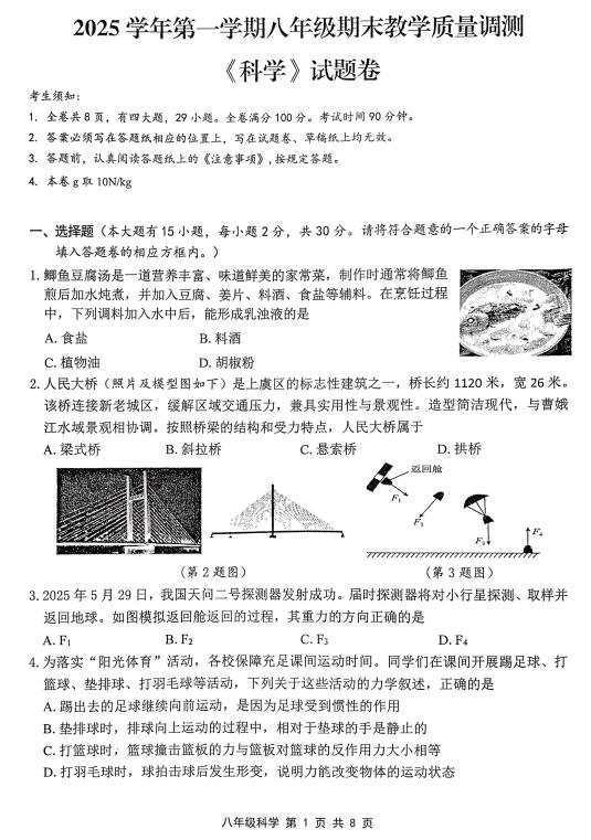 浙江省绍兴市越城区2025学年第一学期八年级期末教学质量调测《科学》试题卷(扫描含答案)