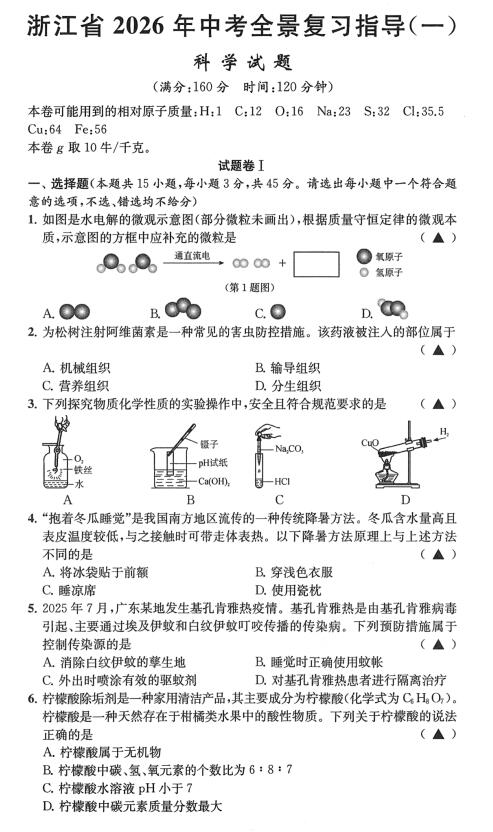 浙江省2026年中考全景复习指导(一)科学试题(扫描版,含答案)