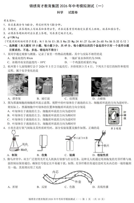 浙江省杭州市锦绣育才教育集团2026年中考一模科学试卷(扫描版,含答案)
