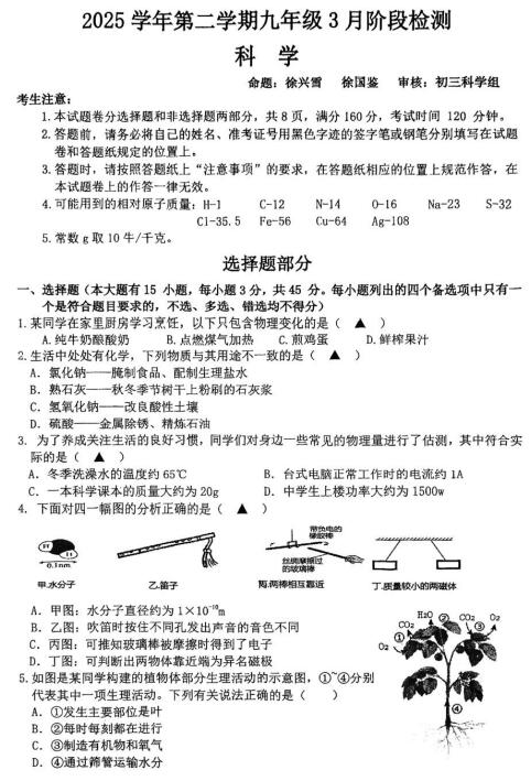 浙江省杭州市建兰中学(公办)2025学年第二学期九年级3月阶段检测 科学(扫描PDF版,无答案)