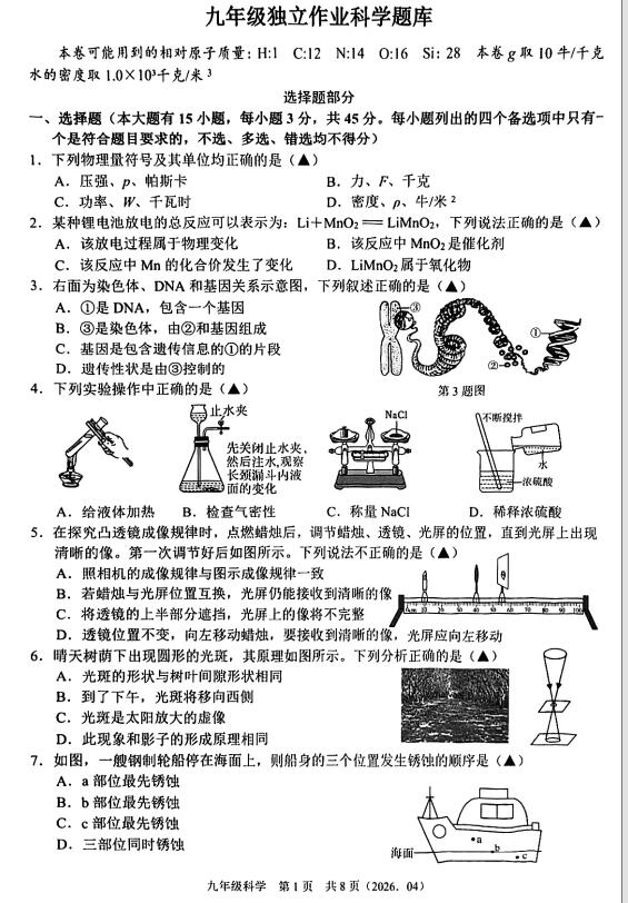 2026年4月浙江省杭州市临平区杭二树兰九年级科学中考模拟卷(扫描pdf版,无答案)