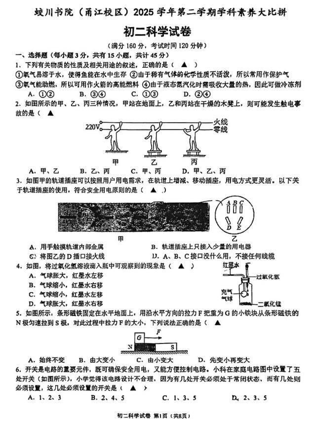 浙江宁波市蛟川书院(甬江校区)2025学年第二学期学科素养大比拼八年级科学试卷(扫描pdf版,无答案)