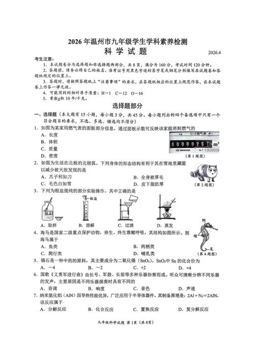 2026.4浙江温州市中考一模科学卷(扫描无答案)