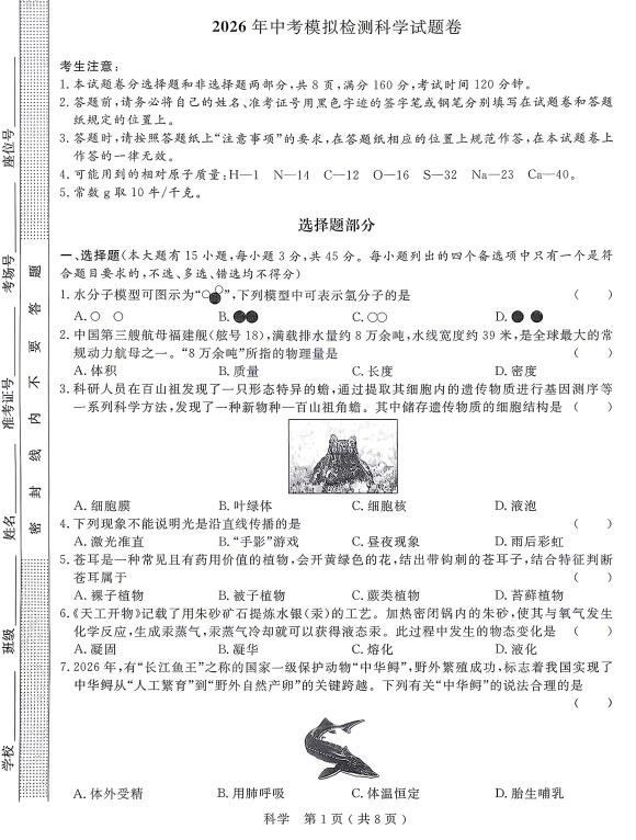 浙江省杭州市临平区、余杭区2026年中考模拟检测科学试题卷(扫描pdf版,含答案)