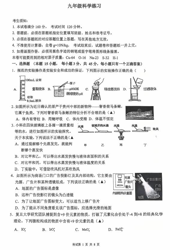 浙江省杭州绿城育华学校2025-2026学年第二学期九年级科学练习(扫描pdf版,无答案)