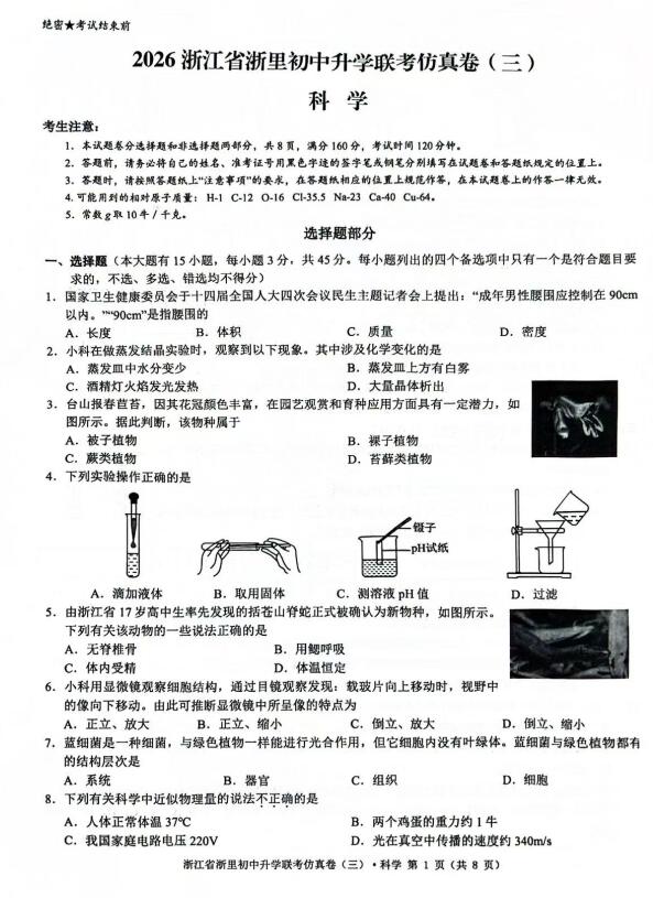 2026浙江省浙里初中升学联考仿真卷(三) 科学(扫描PDF版,含解析)