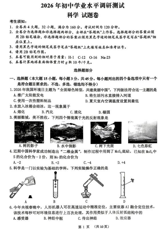 浙江省衢州市2026年初中学业水平调研测试 科学试题卷(扫描PDF版,含答案)