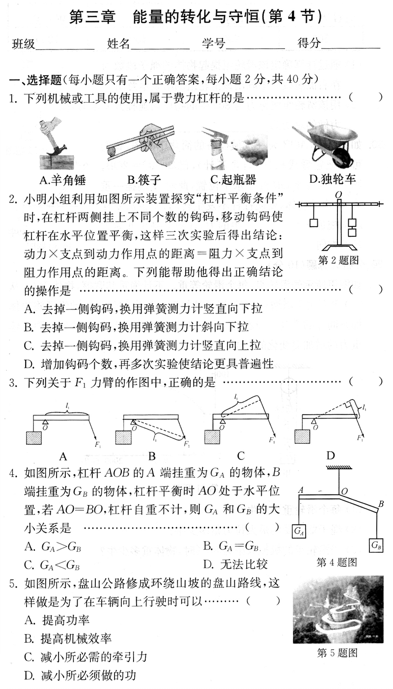 2015[BFB周周清]第三章 第4节 简单机械 单元测试(扫描附答案)