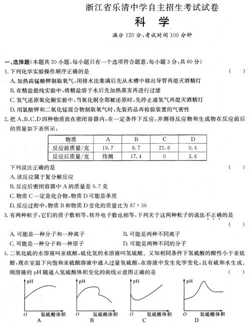 2014学年乐清中学自主招生考试试卷(扫描附答案)