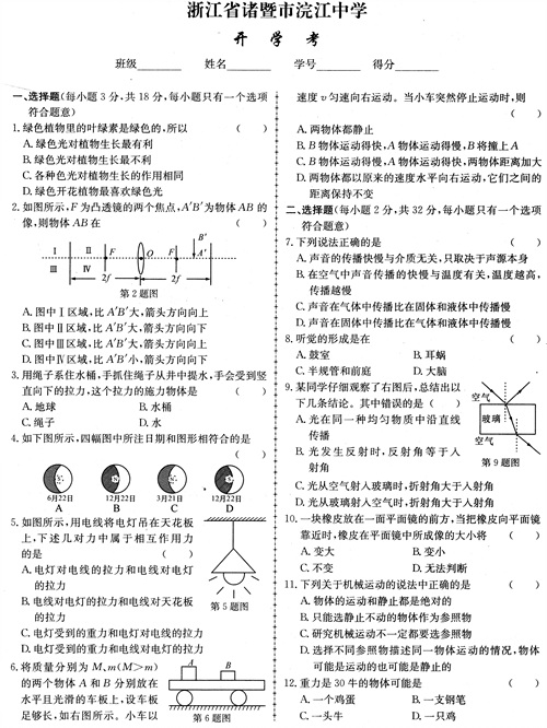 2015浙江省诸暨市浣江中学八年级上开学考(扫描附答案)