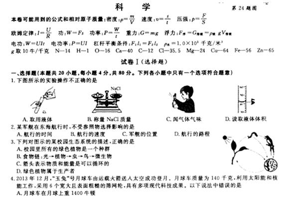 2014年初中毕业生学业考试(绍兴市卷)科学(扫描版,含答案)