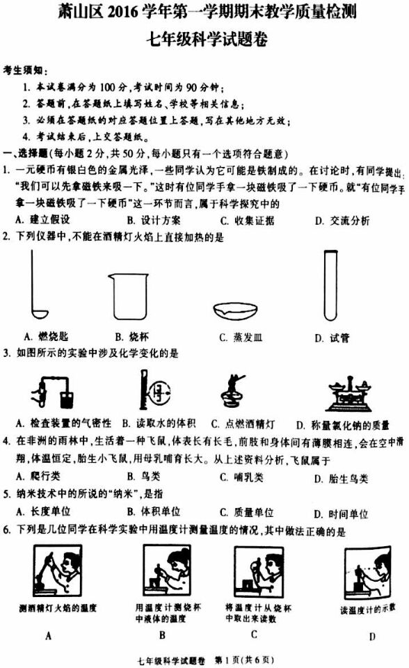 杭州市萧山区2016学年第一学期期末教学质量检测(七年级)(清晰胶版)