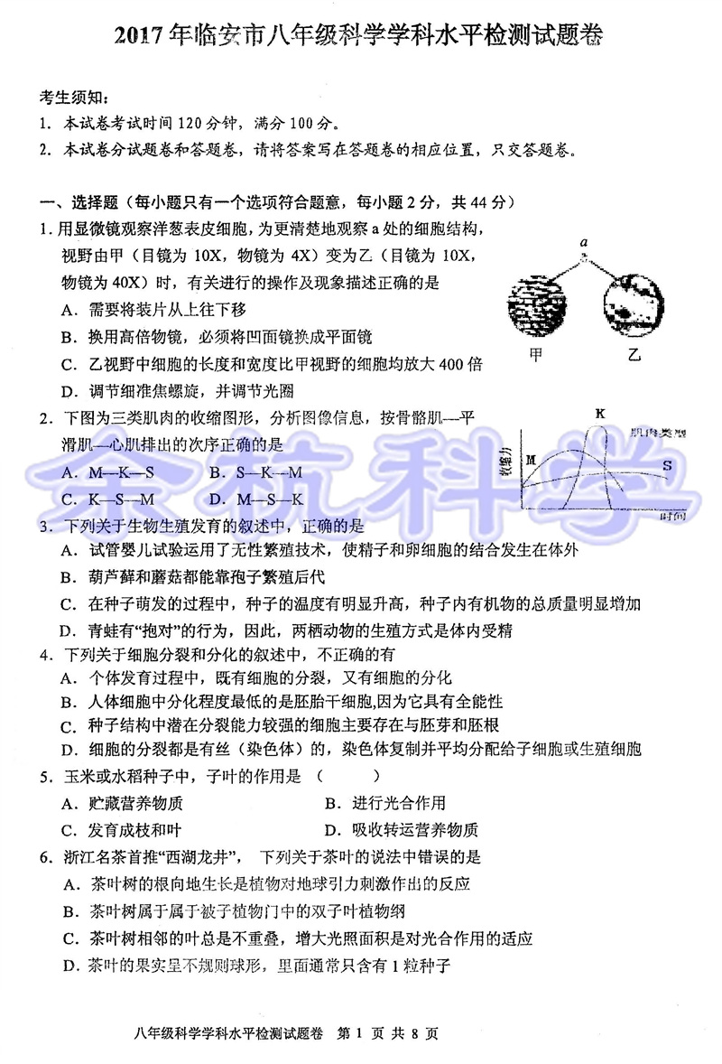 2017年临安市八年级科学学科水平检测试题卷(扫描附答案)