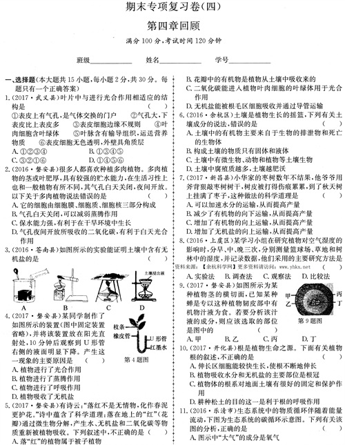 2017学年第二学期八年级期末专项复习卷(四)第四章回顾(扫描附答案)
