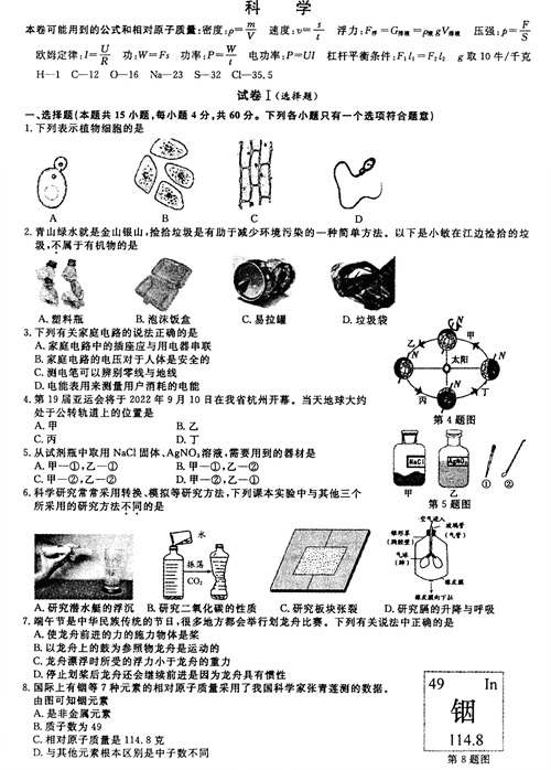 2018年浙江绍兴中考试卷科学卷(扫描附答案)