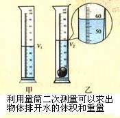 对于问题⑵可以想办法收集物体排开的水,并且测量出被物体排开水的重量。例如利用溢水杯可以方便的收集被物体排开的水(图4);还可以利用量筒通过二次测量法,将量筒中装入一定量的水记录水的刻度V1,再把物体浸没入量筒中,观察量筒中水面的刻度V2,通过计算前后两次的体积差,求出物体排开水的体积V,再根据密度公式可以计算出被物体排开水的重量G=mg=ρVg(图5)。
