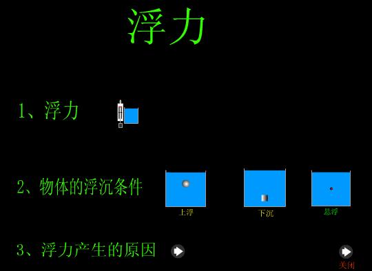 | 本课件以动画形式模拟演示了与浮力有关的实验,主要包括浮力的产生、物体在液体中的浮沉条件、浮力产生的原因等实验,图像清晰、逼真、效果较好。利用本课件可以提高学生学习的积极性和主动性,引导学生思考,可大大提高教学效率。可供教学“浮力”时参考使用,也可供复习浮力时参考使用. |