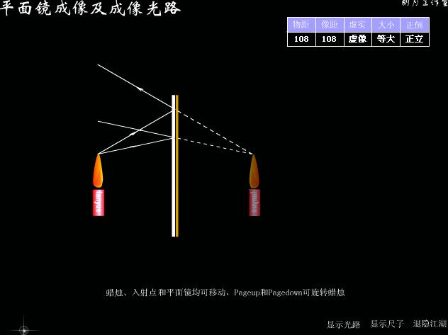 | 课件模拟了探究平面镜成像规律的实验,制作新颖,交互性好。课件中实验器材已经组装好,学生可以通过操作改变蜡烛的位置,像的位置会随之改变,并且能显示出像距和物距、像的大小等,便于学生观察和总结规律。 |